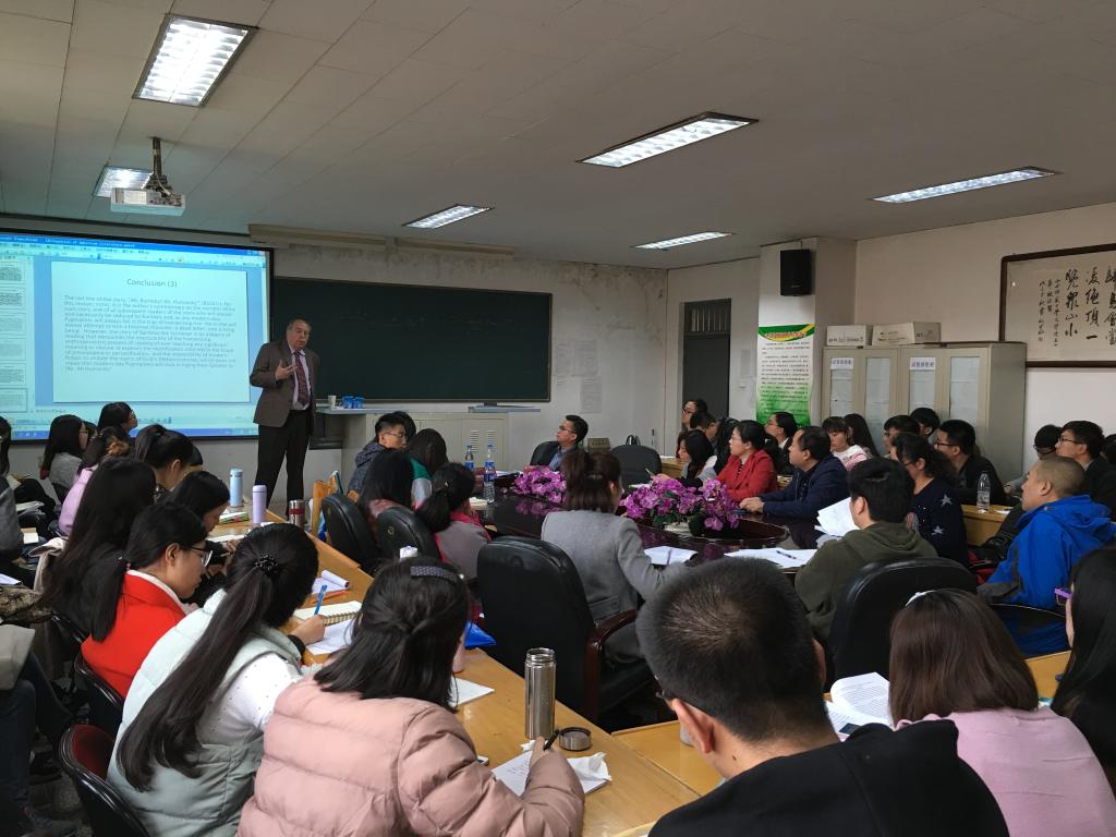 报告上,Massimo Verdicchio教授以爱伦·坡《人群中的人》、霍桑《牧师的黑面纱》、麦尔维尔《抄写员巴特比》三部短篇小说为例,列举了大量的小说文本之内的材料,同时辅以生活中的实例生动地阐述了美国文学中的隐喻。Verdicchio教授认为,文学作品的解读是与其文本本身的不可解读并存,因为作品中的每个人物都是有秘密的,这种秘密又是不希望被别人知道的,犹如人人都戴有一个隐形的黑面纱,作者虚构的故事文本在一定程度上解构了读者找寻这个秘密的一切努力。讲座中,比较文学与世界文学教研室主任高超副教授穿插着对Verdicchio教授用英语讲授的主要内容做了摘要式的解说,他认为Verdicchio教授提出的阅读方法属于美国学院派新批评的“文本细读法”(close reading),它是一种“封闭式阅读”,即把那些传统批评理论中的历史的、伦理的因素、传记材料、读者反应等与文本剥离,而只注重文本,重视文本内部的分析,因此读者解读文本应回归文本自身。