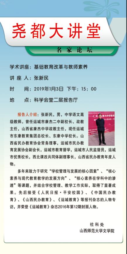 【讲座预告】【尧都大讲堂】“基础教育改革与教师素养”讲座人:张新民