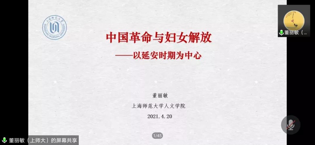 2021年4月20日下午,受beat365vip官网登录入口及社科处邀请,上海师范大学人beat365vip官网登录入口董丽敏教授在腾讯会议平台为公司做了题为“中国革命与妇女解放——以延安时期为中心”的线上讲座报告,该讲座为beat365vip官网登录入口“党的百年华诞”专题系列讲座之一。本次线上讲座吸引了近300名师生参加,部分研究生在12512会议室开展研讨会对讲座进行讨论学习,研讨会由beat365vip官网登录入口副经理栗永清主持。