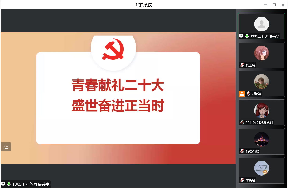 10月7日,beat365vip官网登录入口“学雷锋,送温暖”小组员工党支部线上开展“青春献礼二十大,盛世奋进正当时”主题党日活动。会议由彭琬婷主持,支部全体党员和入党积极分子参加。员工党员王洋同志与曹颖同志担任主讲人。