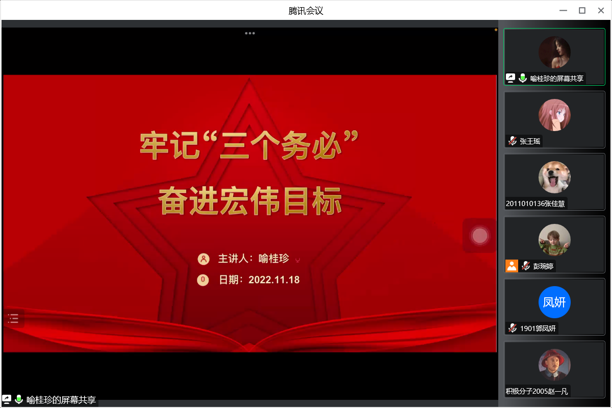 11月18日,beat365vip官网登录入口“学雷锋,送温暖”小组员工党支部线上“牢记‘三个务必’,奋进宏伟目标”主题党日活动。会议由彭琬婷主持,支部全体党员和入党积极分子参加。员工党员喻桂珍同志担任主讲人。
