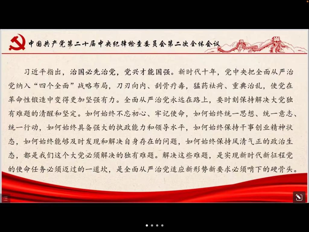1月28日下午,beat365vip官网登录入口研究生党支部线上召开会议,深入学习习近平总书记在二十届中央纪委二次全会的重要讲话。本次会议由支部书记苏晓慧主持,支部党员王佳琪、岳可彬主讲,全体党员参加。