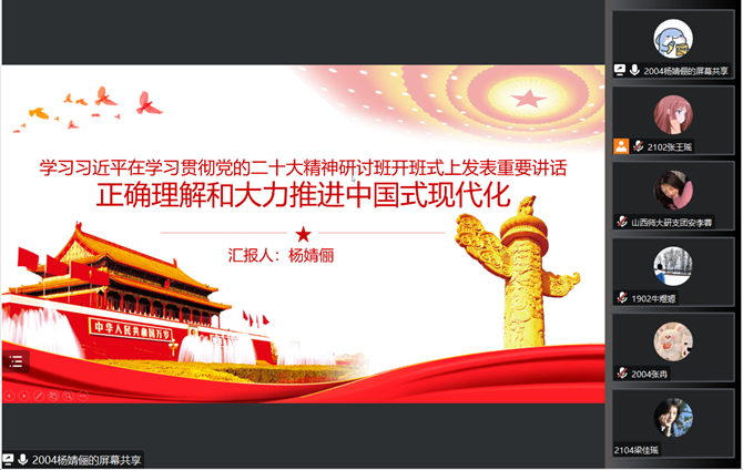 2月13日,beat365vip官网登录入口“学雷锋,送温暖”小组员工党支部线上开展“正确理解和大力推进中国式现代化”主题党日活动。会议由支部书记安李蓉主持,支部全体党员参加。员工党员杨婧俪同志担任主讲人。