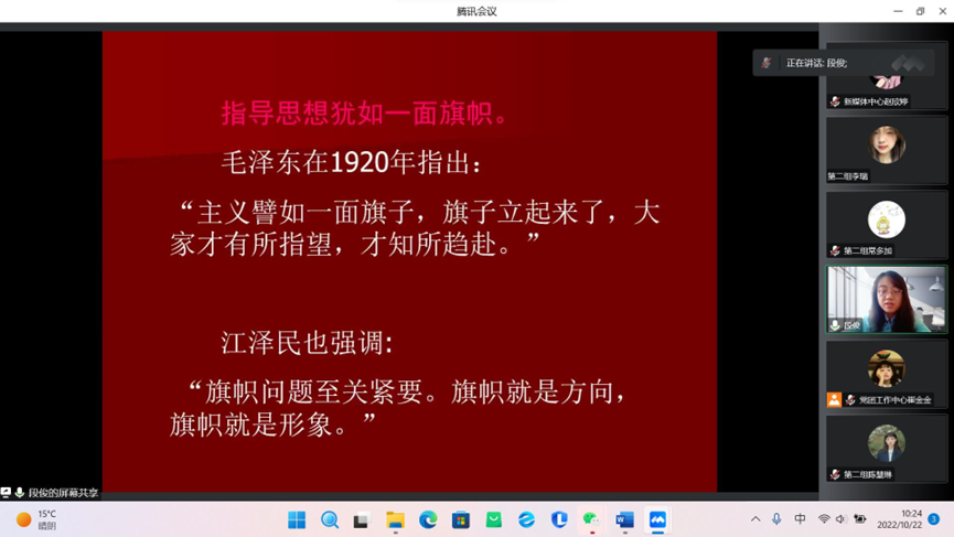 beat365vip官网登录入口副经理段俊,以“指导思想犹如一面旗帜”开题,为大家讲解了中国共产党的指导思想。她指出,将党的指导思想与中国具体实践相结合是推进我国发展事业行稳致远的重要前提。