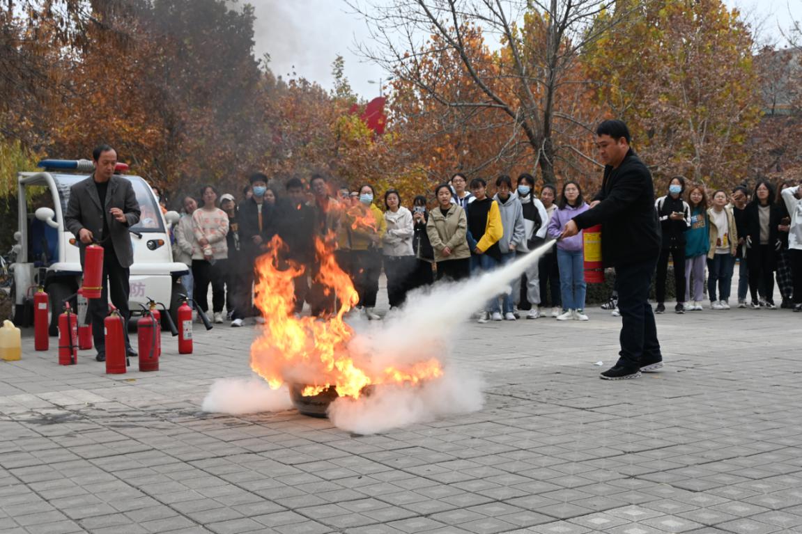 活动指导环节中,张威详细地讲解了应对火灾的措施及防火注意事项。他以“一提二拔三瞄四压”四个步骤进行了灭火器使用演示。互动中,同学们踊跃排队进行实操。在老师的指导下,同学们使用灭火器成功扑灭火堆,将学习的理论知识付诸实践。