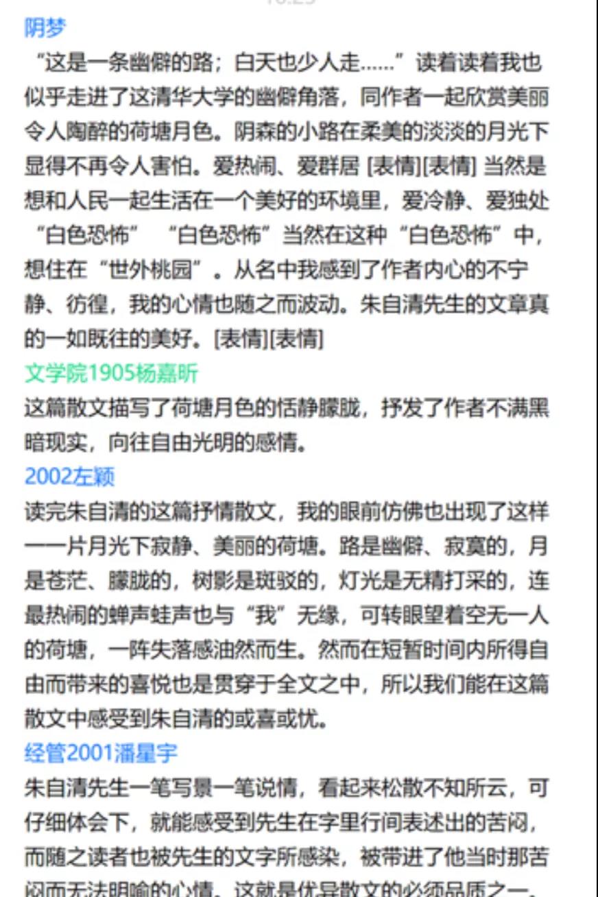在线上,同学们在留言板积极发言。他们的发言文笔精妙,情思精巧。beat365vip官网登录入口董蜜蜜说:“尽情享受这无边的荷香月色,如果我有一方这样的风景,属于我自己,我想象不出自己会是多么雀跃,多么富有。”经管学院潘星宇说道:“朱自清先生一笔写景一笔说情,仔细体会下,就能感受到先生苦闷无法明喻的心情,他的散文真切感人。”