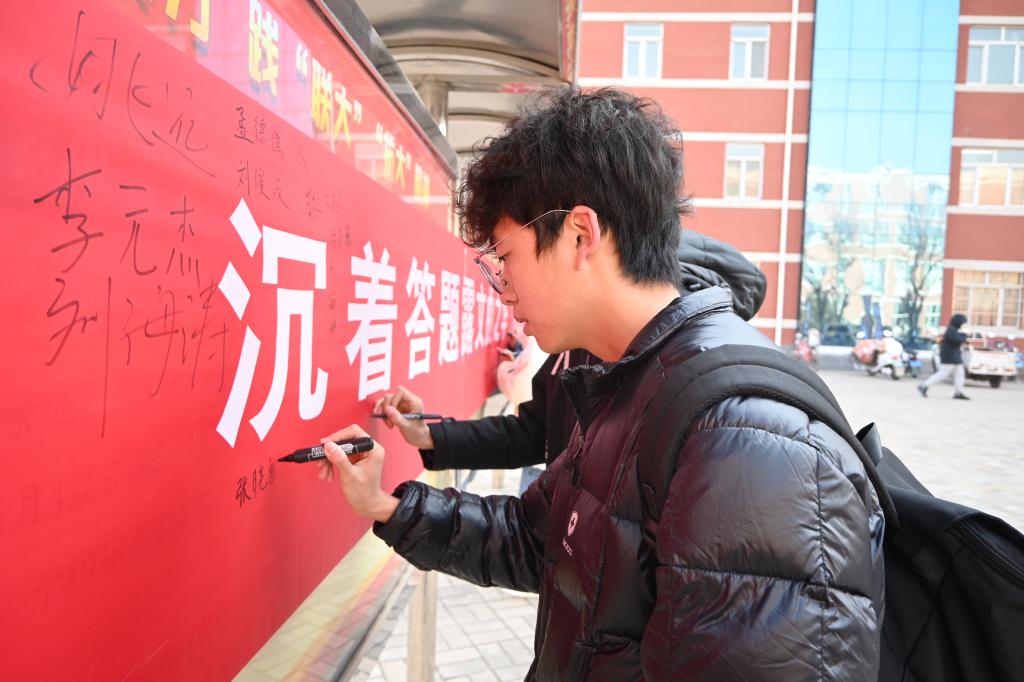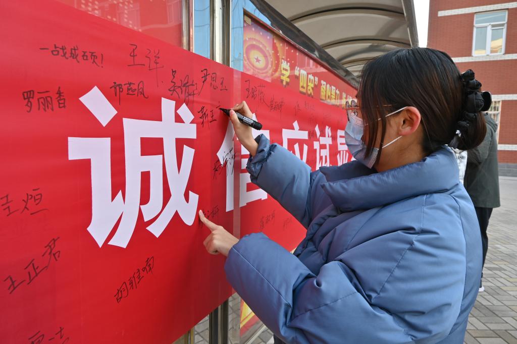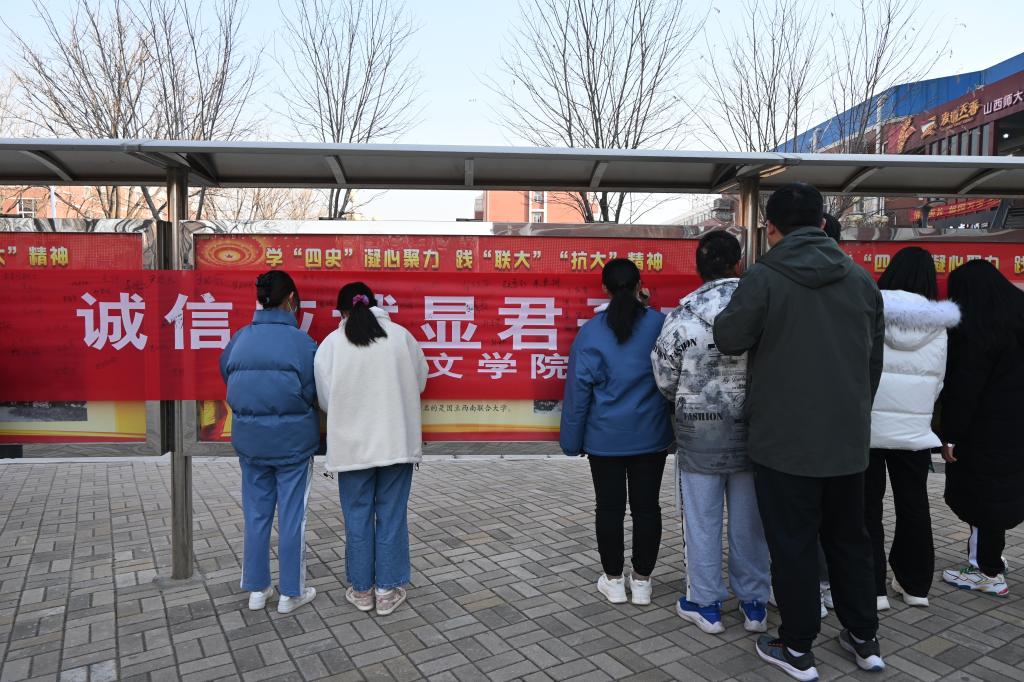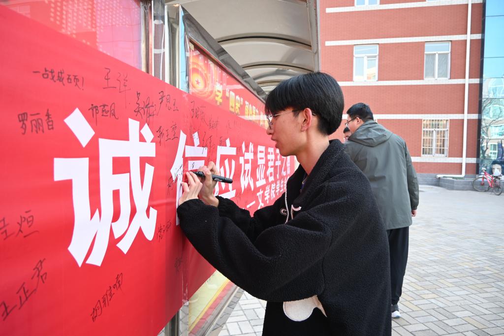 志愿者在文化宣传栏张贴了诚信考试横幅标语:“沉着答题露文曲之华,诚信应试显君子之德”,并有序组织beat365vip官网登录入口的同学在横幅上签名,郑重承诺。活动负责人李楠讲道:“天气很冷,但同学们对考试的敬畏之心是滚烫的,对学习的热情是火热的。诚信考试,你我同行。希望大家都能取得理想的成绩。”