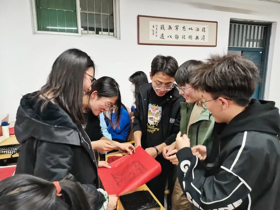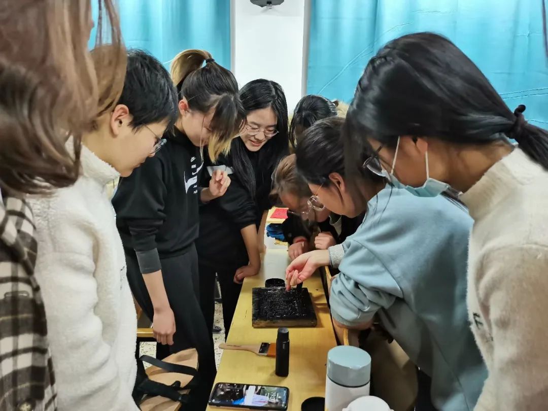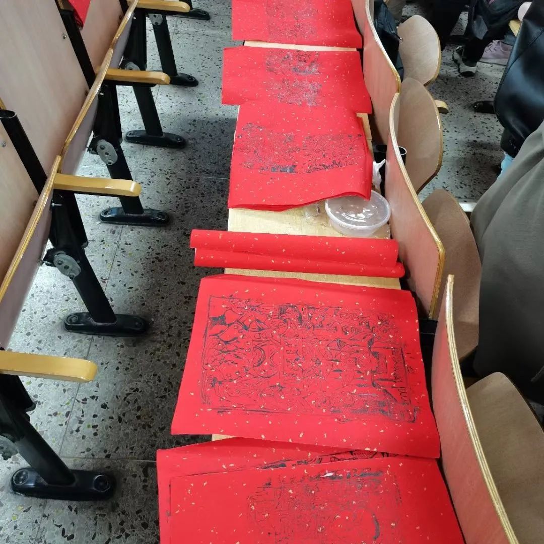 实践开始前,吕老师讲述了木版年画技艺等文化知识,现场演示了木版年画拓印的基本流程。随后,大家开始合作拓印木版年画。一人拿着刷子,轻轻蘸墨浸润木版线条;一人快速将洒金纸铺于版上,刷子按压拓印,把纸迅速揭起;一人负责年画的排序晾晒、后续清洗工作。在同学们的努力下,一张张印有天地爷、财神爷、灶王爷、马王爷、土地爷等传统神灵图案的木版年画被完整拓印出来,欢欣愉悦之情洋溢着整个课堂。