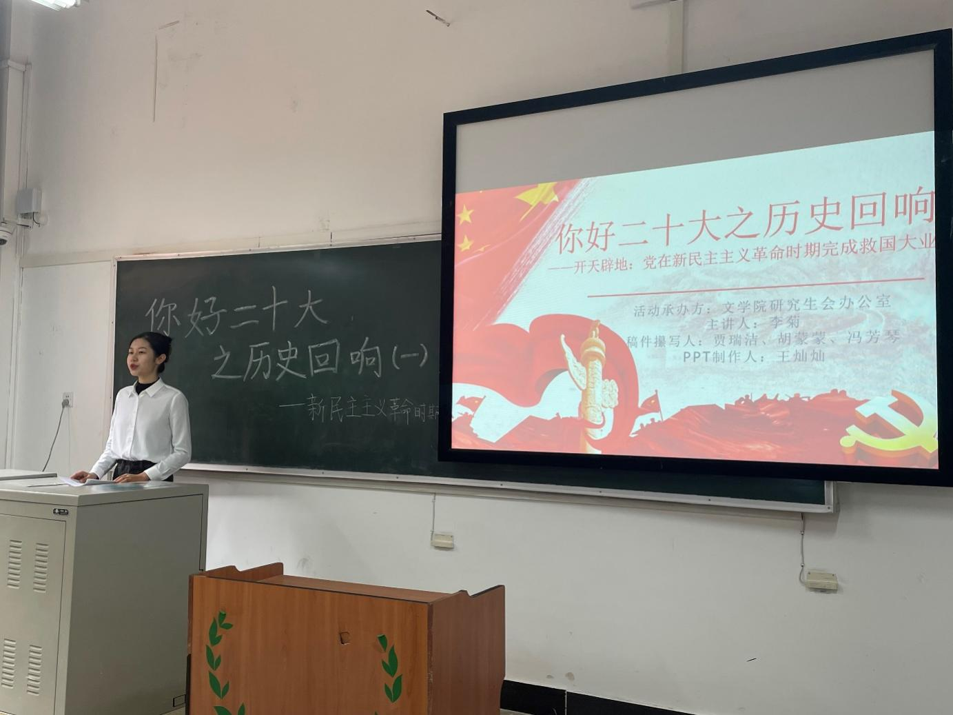 11月4日上午,beat365vip官网登录入口研究生会在3号教学楼102教室举办了党的新民主主义革命史宣讲活动。本次活动是“你好二十大之历史回响”系列活动的第一部分,由研究生会办公室成员王灿灿主持,30余名beat365vip官网登录入口研究生共同参加。