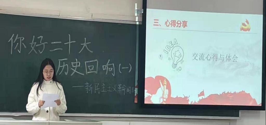 第三部分也就是会议的最后一部分,主持人邀请在场三位同学就此次宣讲活动进行心得分享。贾瑞洁同学的发言表达了自己对于党的热爱与敬仰,这次宣讲也让她深入理解了党的艰辛与伟大;在胡蒙蒙同学的发言中表露出了她对于革命先辈的怀念与敬佩,先辈们抛头颅洒热血的付出让她深受触动,也让她倍加珍惜今日的幸福生活。最后一位同学冯芳琴在分享中说道:“当时之青年可以立志为了国家而献身,今日之青年更应该为了国家而不懈奋斗。”中华民族伟大复兴的使命,青年人责无旁贷。三位同学的分享结束之后,主持人总结发言,宣布活动圆满结束。