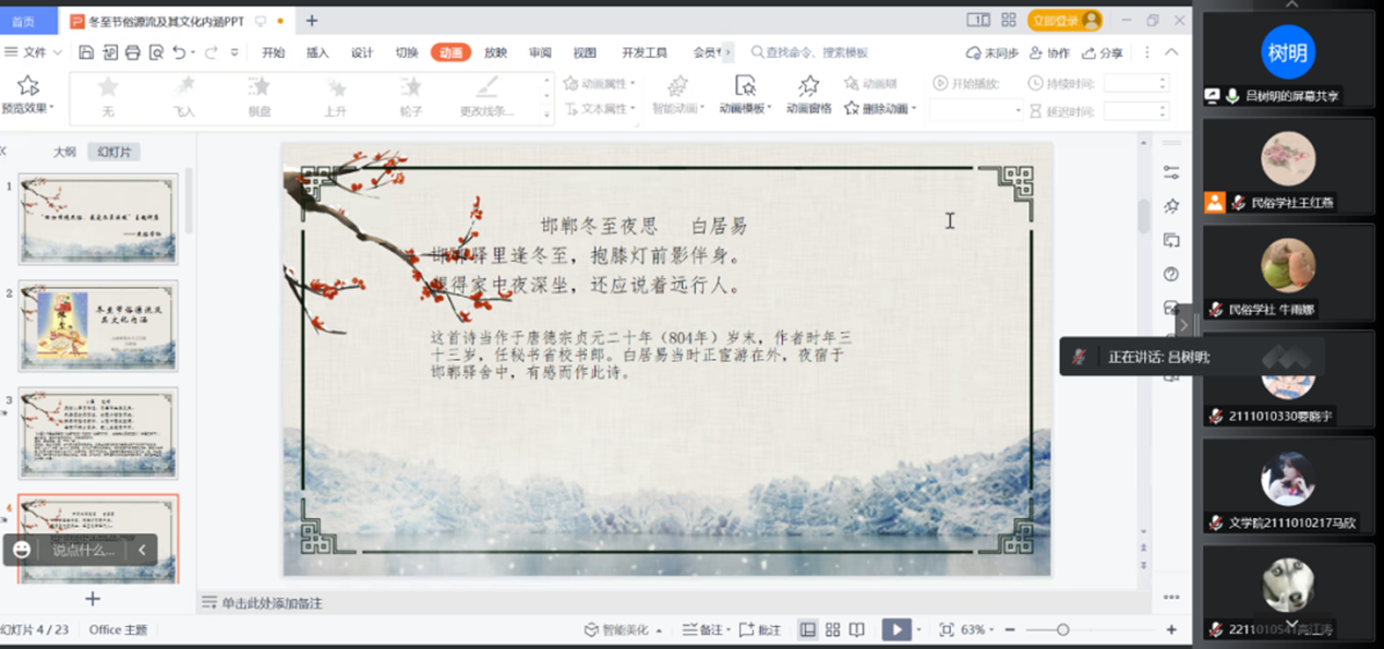 活动伊始,主持人介绍了冬至的重要性以及主讲老师。随后,讲座正式开始。吕老师围绕多方面、图文并茂地讲述了冬至节俗源流及文化内涵。吕老师通过讲述《小至》、《邯郸冬至夜思》两首古诗,引出了冬至对于中国古代人民的意义所在,又从自然历法、社会人文对冬至的节气属性进行了详细的介绍。老师讲解的中国冬至节俗也让同学们听的津津有味。老师也从山西省内的冬至节俗出发,谈到了太原市的冬至习俗,将冬至知识与亲身体验相结合。最后,同学们各抒己见,就“冬至家乡民俗”分享自己的感受,活动气氛十分活跃。