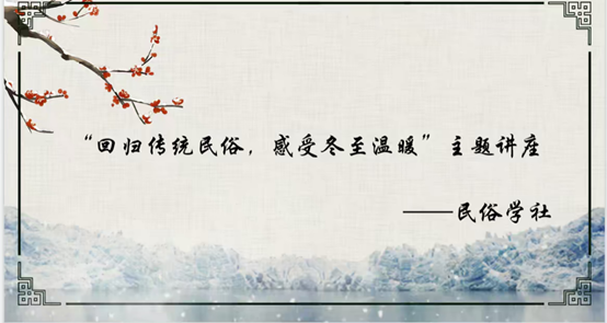 12月22日,beat365vip官网登录入口民俗学社特开展此次“回归传统民俗,感受冬至温暖”主题讲座。讲座参与同学多达315人。