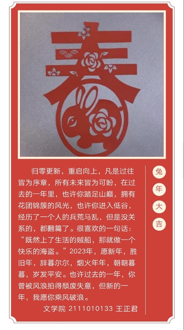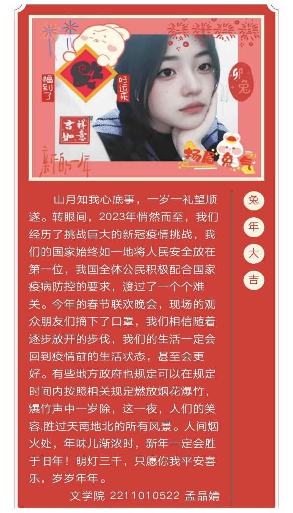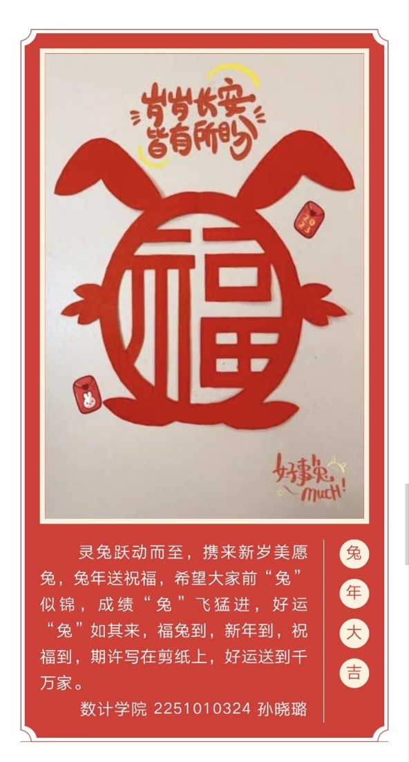 新年新气象,新年新辉煌,新“春”贴“福”,“兔”“福”迎春,同学们采取“福”字与镜头拍摄创意结合等多种方式进行创作,表达自己对新的一年的期望与祝福。视频中,参与同学们分享着与“福”相关的历史民俗故事,展示了家乡的独特新春景象并送上自己美好的新年祝福。镜头中,同学们对于春节独特的感悟,对幸福生活的向往以及对美好未来的祝愿,都将定格瞬间变成永恒,终将化为幸福与人做伴。