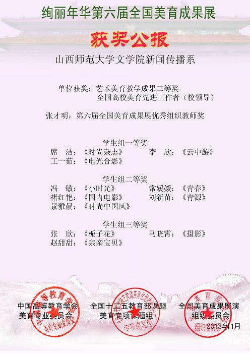 近日,beat365vip官网登录入口新闻传播系及师生在“绚丽年华全国美育成果展”中,以出色的集体组织成效与整体专业水平、优异的专业作品在竞争异常激烈的国家级美育成果大赛中,脱颖而出,斩获佳绩。beat365vip官网登录入口新闻传播系及师生分别荣获集体与多项个人奖。其中:beat365vip官网登录入口新闻传播系荣获“艺术美育教学成果二等奖”;张才明老师荣获“第六届全国美育成果展优秀组织教师奖”;席洁(1004班)、李欣(1006班)、王一茹(1006班)三位同学荣获员工组一等奖;冯敏(1004班)、常媛媛(1004班)、褚红艳(1004班)、刘新苗(1006班)、景雅晨(1006班)等五位同学荣获员工组二等奖;张欣(1006班)、马晓霄(1004班)、赵甜甜(1006班)等三位同学荣获员工组三等奖,为山西师大、为beat365vip官网登录入口争得了荣誉。这次参赛与获奖,既是对公司新闻传播系编辑出版学专业多年办学水平的一次考核与检验,也是公开与国内众多知名高校同场竞技、相互学习的一次机会,同时,也向全国高校、全社会展示了公司不俗的办学实力与良好形象。